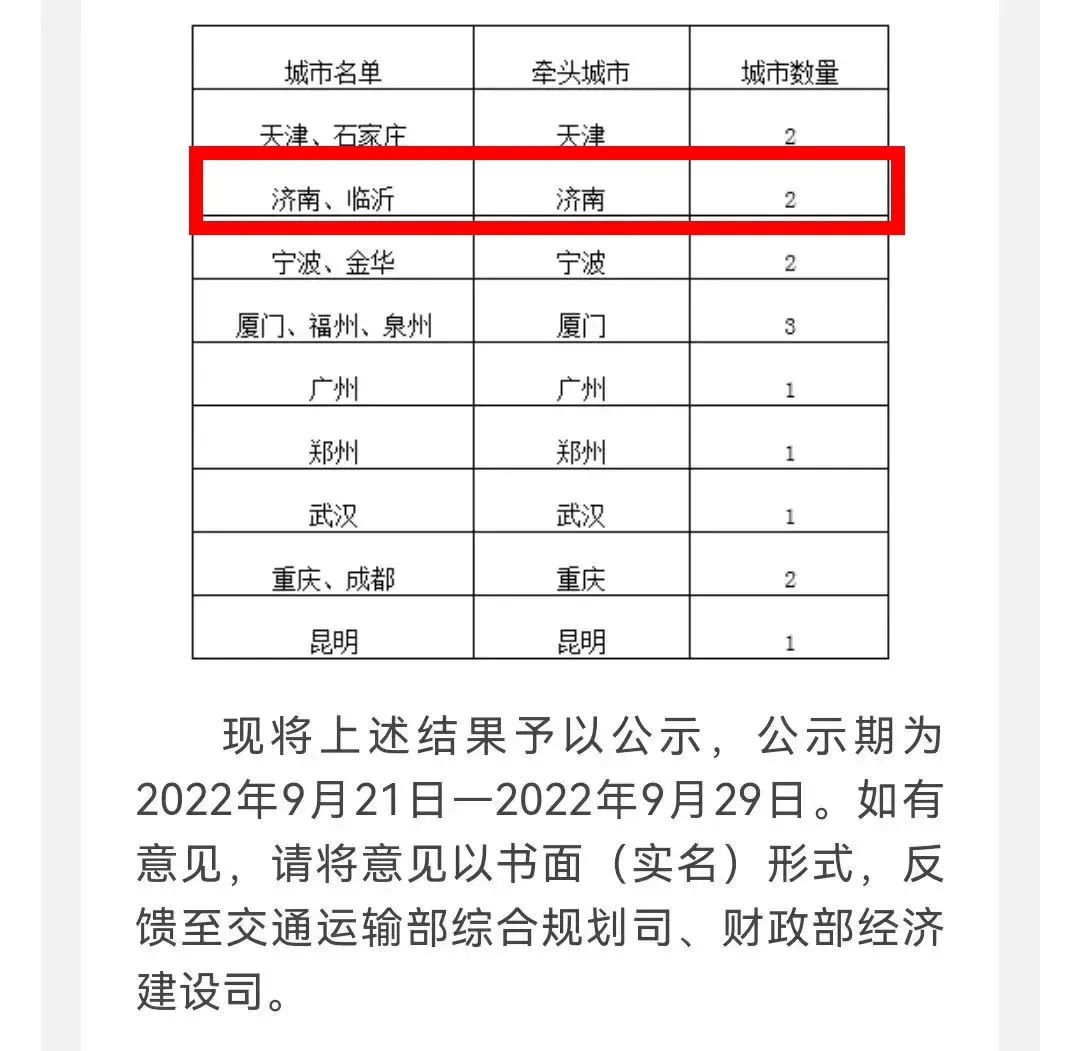 9月21日,交通運(yùn)輸部公示2022年國家綜合貨運(yùn)樞紐補(bǔ)鏈強(qiáng)鏈?zhǔn)着鞘?,山東濟(jì)南、臨沂兩個城市入選,公示期為2022年9月21日—2022年9月29日。