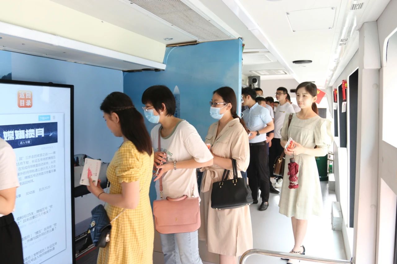6月12日上午,澎湃新聞“建黨百年 初心之路”全媒體巡展大巴車隊駛?cè)腠樅椭辈ル娚炭萍籍a(chǎn)業(yè)園,通過交互式、沉浸式的全媒體體驗方式,向產(chǎn)業(yè)園內(nèi)直播電商行業(yè)工作者們展示百年黨史,帶領(lǐng)他們回顧中國共產(chǎn)黨的浴血之路、建國之路、改革之路、復(fù)興之路,對百年奮斗歷史、發(fā)展成績、未來展望等做全景式巡展。