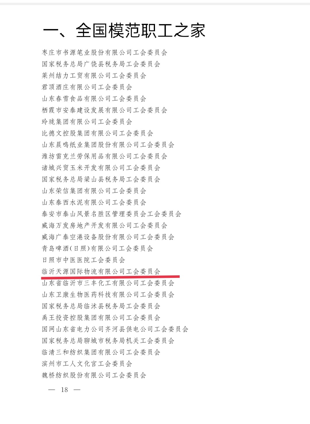 2020年12月31日,臨沂天源國際物流有限公司工會委員會被全國總工會授予“全國模范職工之家”榮譽稱號。建設深受職工信賴的職工之家,當好職工信賴的娘家人,是工會工作的永恒課題。天源工會委員會將繼續(xù)發(fā)揮示范帶頭作用,牢記黨的全心全意依靠工人階級的方針,堅定不移走中國特色社會主義工會發(fā)展道路, 強基層、補短板、增活力,切實維護職工合法權益、竭誠服務職工群眾,努力構建和諧勞動關系。