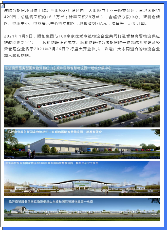 其增量項目臨沂商貿(mào)服務(wù)型國家物流樞紐順和國際智慧物流園是省市區(qū)重點項目,